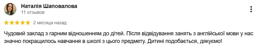 Ґрунтовно опрацьовуємо всі аспекти вивчення мови (читання, говоріння, аудіювання, вивчення лексики та граматики). Програма занять включає у себе вивчення та закріплення усіх граматичних та лексичних тем, визначених навчальною програмою МОН. Таким чином допомагаємо учням усунути причини неуспішності, подолати комунікаційний бар’єр та оволодіння достатнім словниковим запасом. Також у наших учнів не виникає проблем зі здачею ДПА у 9 класі.